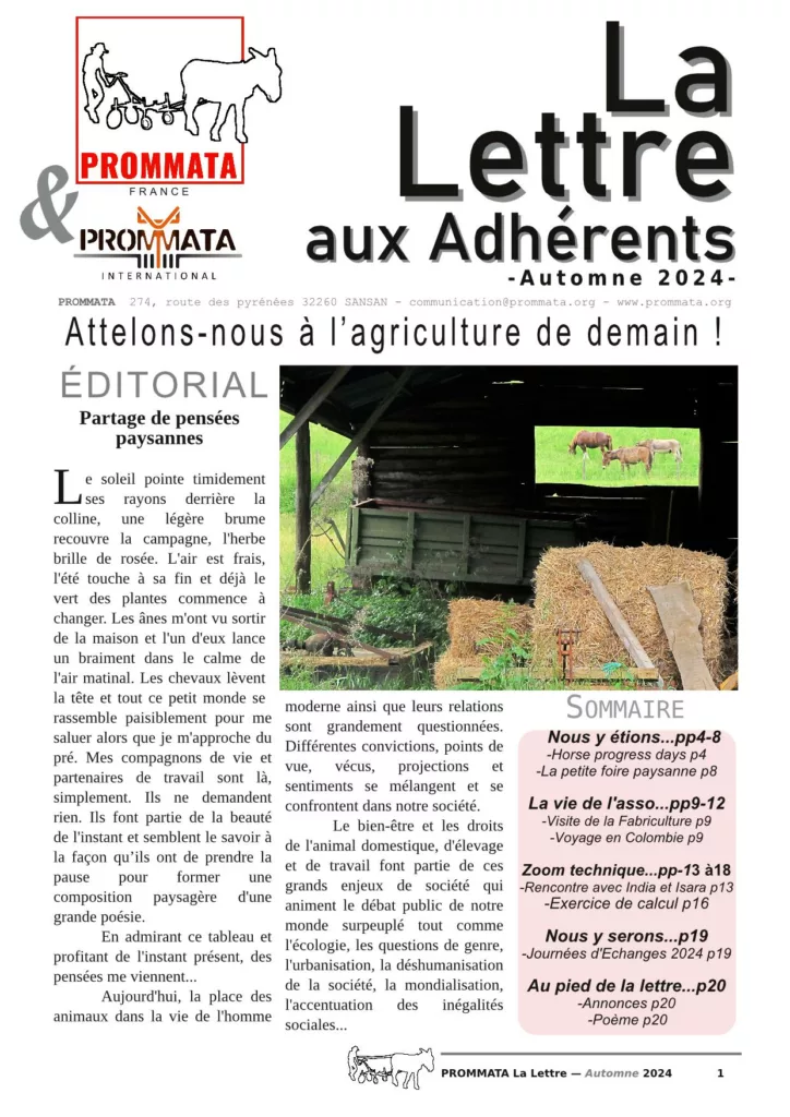 A peu près deux fois par an, Prommata publie un magasine destiné aux adhérents et sympathisants. Ce petit journal plus ou moins bisannuel contient des articles d’information sur les activités de l’association, sur l’agriculture, sur la traction animale en France et dans le monde, il contient aussi des dossiers techniques ou des sujets de fond, des témoignages, des études, des expérimentations, des comptes rendus de voyages ou d’évènements avec des photos et de la poésie…